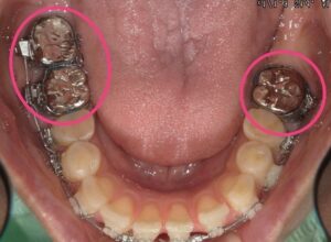 その後、バンドとブラケットを歯につけ、ワイヤーを通して歯を動かし始めます。