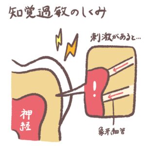 象牙質の中には神経につながる細い管のような構造がたくさんあり、歯ブラシの刺激や冷たいもの・温かいものの刺激が、その管を通して神経に伝わります。その結果、私たちが感じる「しみる」という症状が出てくるのです。